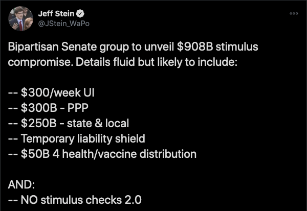 Jeff Stein released a report of a stimulus compromise package introduced by a bipartisan group, headlined by Steve Manchin and Susan Collins. It contains a few good things but still badly misses the mark for what America needs right now, here it is: